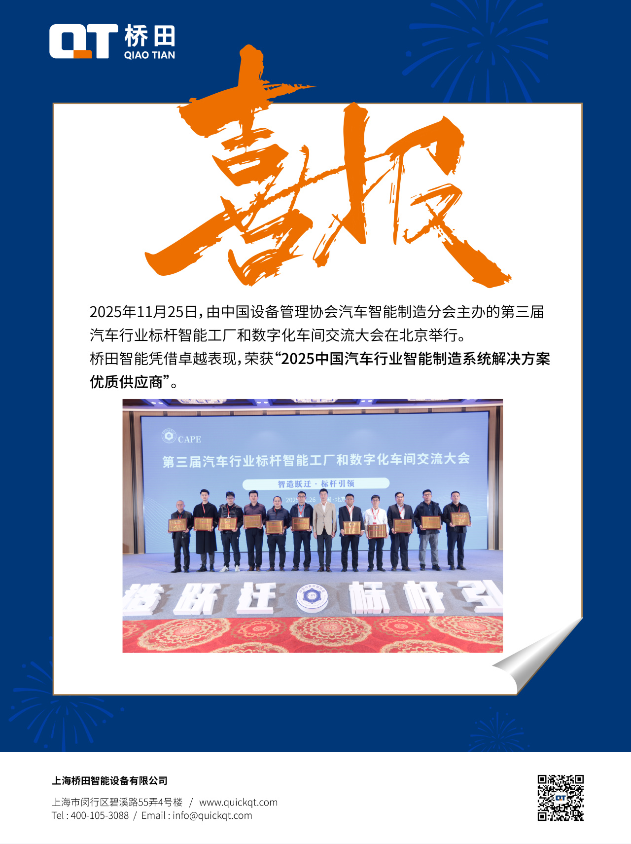 2025年11月25日,由中国设备管理协会汽车智能制造分会主办的第三届汽车行业标杆智能工厂和数字化车间交流大会在北京举行。桥田智能凭借卓越表现,荣获“2025中国汽车行业智能制造系统解决方案优质供应商”