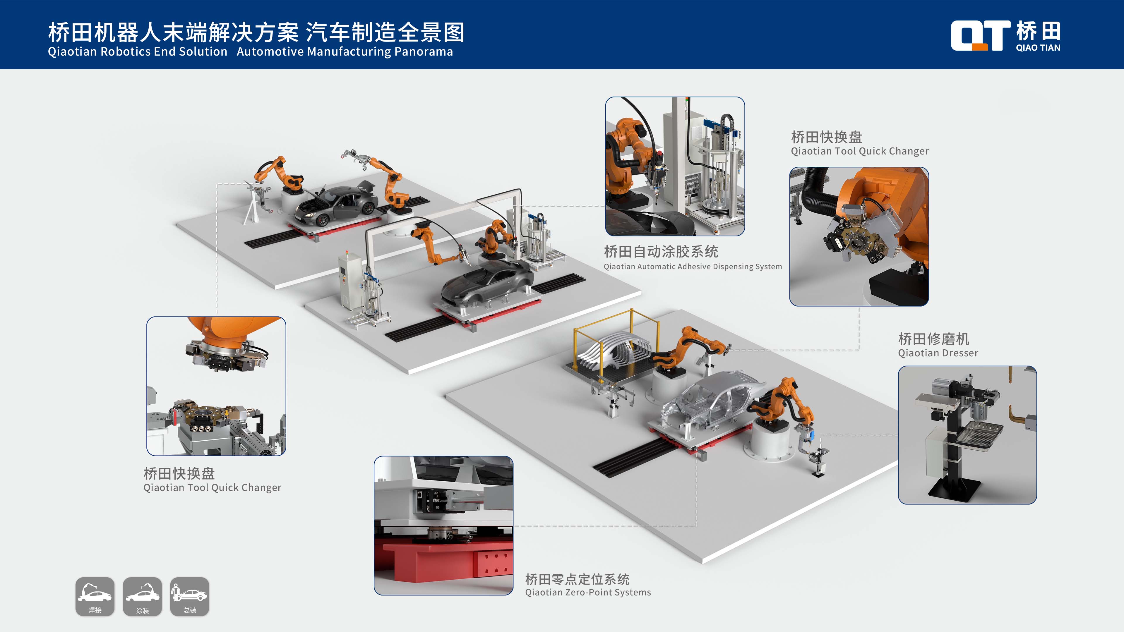 核心观点总结:民企成长的双重修炼 整场交流下来,关于“企业如何做值钱”和“突破创始人天花板”两大主题,大家形成了不少共识。在刘小平看来,民营企业的成长,本质上就是“价值重构”与“自我突破”的双重修炼:“做值钱”是根基,需要靠体系化能力筑牢价值底盘;突破创始人天花板是动力,需要创始人跟着公司规模分阶段迭代角色。 结合桥田的高端替代定位,还有学员问到了行业趋势,刘小平也和大家分享了自己的分析:机器人末端设备领域技术壁垒高,认证周期长,比如TÜV安全认证、VDA6.4认证都需要长期积累,头部客户攻克也得3到5年,这对中小企业来说是门槛,但也是机遇。 图示:桥田机器人末端解决方案 汽车制造全景图