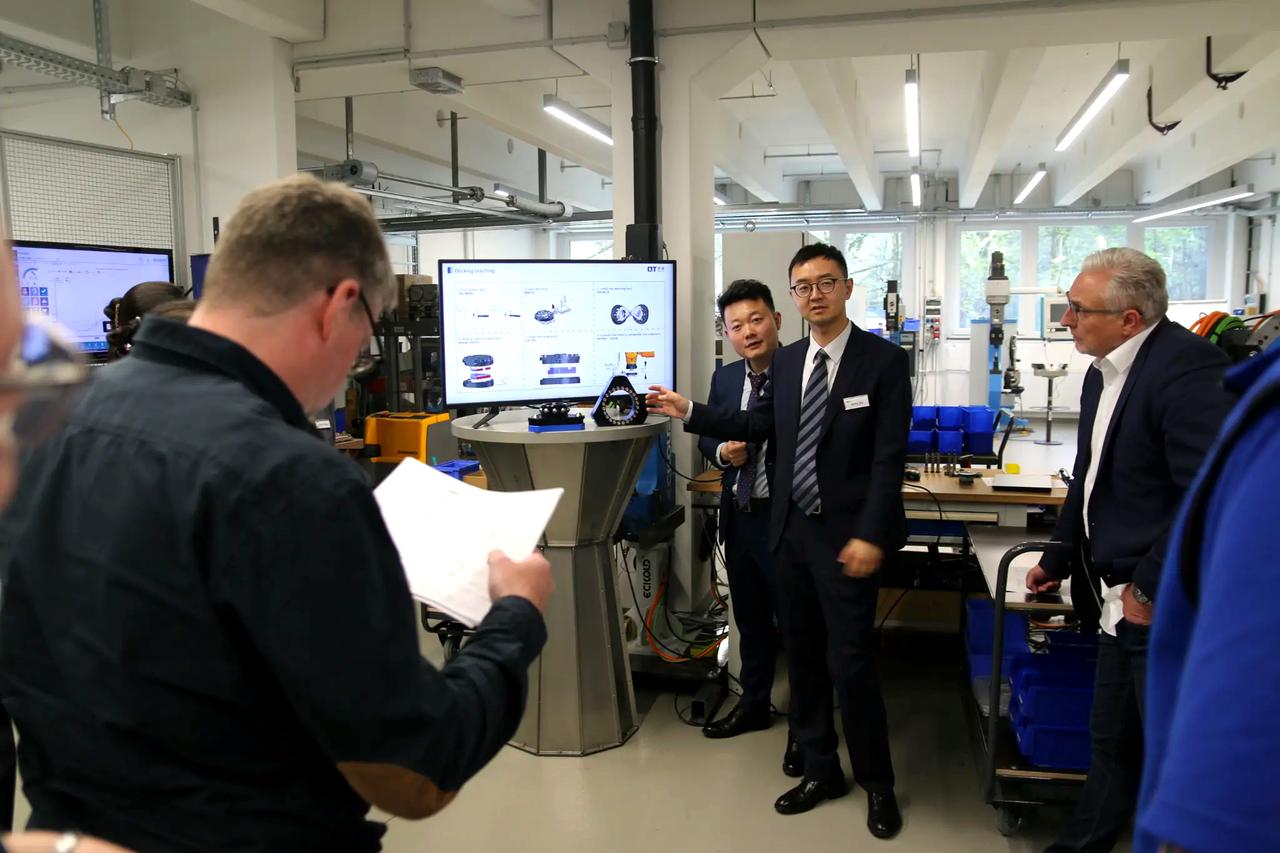 在ECKOLD集团董事长魏总及总经理Patric Daske的陪同下,桥田智能团队参观了ECKOLD的现代化生产车间、机器人工作站及相关配套设施。现场展示的伺服电机压铆系统、高柔性自冲铆接系统以及ECKOLD Visualisation可视化平台,直观呈现了其在无烟尘、低噪音冷连接技术及数字化生产管理方面的实际应用能力。